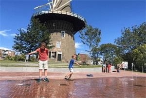 Als je de garage uitloopt, kom je langs speelse fonteintjes. Die kunnen wel eens wat los maken bij de kinderen, dus neem extra kleren mee voor de zekerheid…