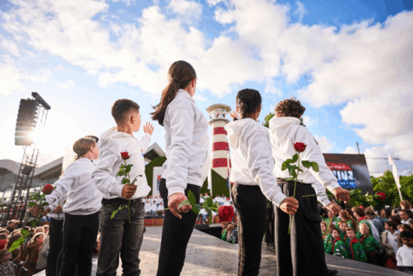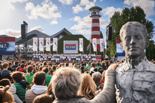 Tijdens de herdenking staan duizenden kinderen en jongeren samen stil bij vrijheid. Je kijkt en luistert naar het programma op het voorplein van Madurodam.