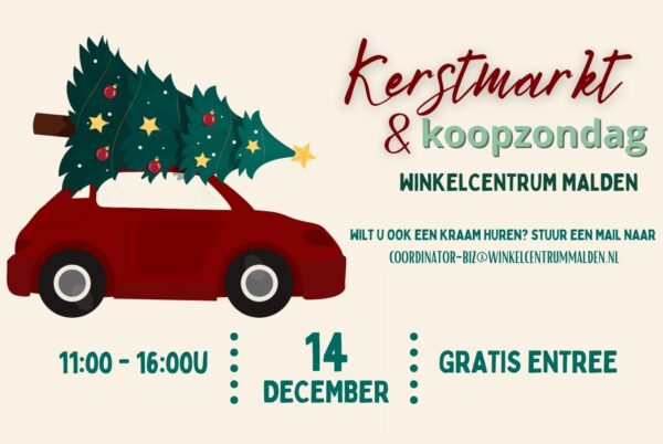 Op zondag 14 december is in Winkelcentrum Malden de jaarlijkse kerstmarkt. Van 11.00 – 16.00u vind je er heel veel kramen met een heel divers aanbod: zelfgemaakte sieraden, kerststukjes, boeken, woonaccessoires en nog veel meer.