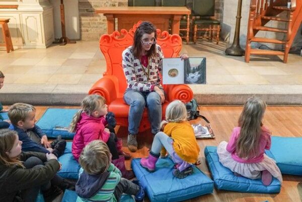 In de grote kerk ontstaat een klein, knus hoekje waar kinderen vanaf drie jaar heerlijk kunnen wegzakken in een verhaal. De voorlezers lezen rustig, beeldend en met precies genoeg humor.