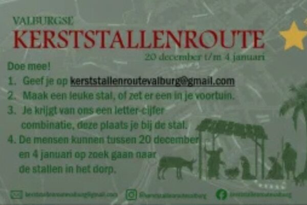 Van 20 december tot en met 4 januari wandel je door Valburg langs kerststallen die bewoners in hun voortuin hebben geplaatst. Elke stal is anders, soms klein en eenvoudig, soms juist uitgebreid, en juist dat maakt deze route zo leuk om samen te lopen.