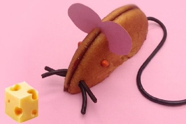 Dit grappige visje is versierd met rozijnen, plak ze vast met zelfgemaakte glazuur (een papje van poedersuiker met water). In dit mooie spinnenweb zitten nog geen diertjes maar dat zal vast niet lang meer duren! De draden van het web zijn gemaakt van eetbare decoratiestift. Piep, kijk een muis! Plak 2 helften van een eierkoek op elkaar, maak oortjes van (eetbaar)papier en snorharen en een staartje van een dropveter. Zo, jouw traktatie is klaar!