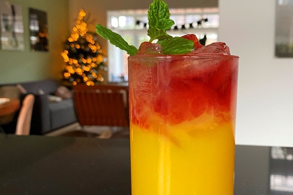De cocktail hieronder lijkt op de ’tequila sunrise’ maar dan onderste boven en uiteraard zonder tequila! Heel simpel begin je met ijsklontjes in een longdrink glas, daar giet je jus d’orange op tot een centimeter van de rand. Dan giet je er heel langzaam grenadine in, deze blijft dan mooi aan de bovenkant zitten. Maak het af met een takje verse munt en een rietje!