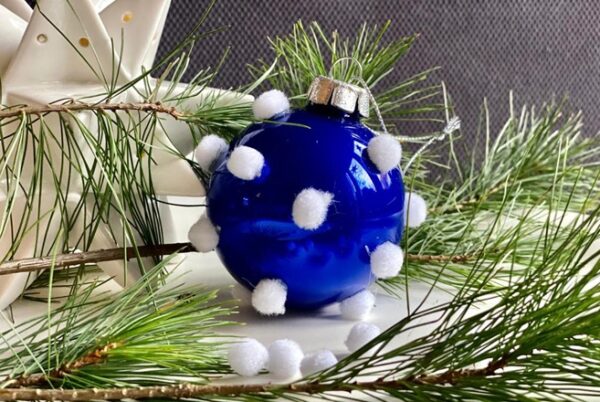 Je kent ze wel, die knutselbolletjes in allerlei kleuren. Voor deze kerstbal gebruikten we witte bolletjes voor het leuke winters effect. Eenvoudig met wat lijm erop te brengen.