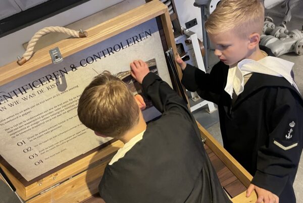 Toen uiteindelijk alle kisten geopend waren en het mysterie was opgelost, gingen we naar de museumwinkel. Daar wachtte nog een laatste verrassing: een stoere marineketting voor ieder kind. Een perfecte beloning voor hun inzet en doorzettingsvermogen.