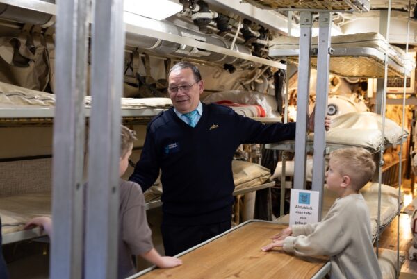 Maar het avontuur was nog niet helemaal voorbij. Buiten kregen we de kans om een echte onderzeeër te bezoeken. Aan boord werden we verwelkomd door oud-medewerkers, die vol passie vertelden over het leven onder water. De kinderen hingen aan hun lippen en stelden veel vragen.