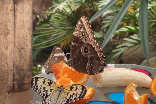 Op een zonnige dag in maart ben ik samen met Donna naar Vlindertuin Vlindorado in Waarland geweest. Bij binnenkomst kopen we bij de balie nog wat vissenvoer en krijgen we de gratis speurtocht mee. Als we door de klapdeuren de vlindertuin binnenlopen, wanen we ons direct in een exotisch oord. Door de warme temperatuur, de hoge luchtvochtigheid en natuurlijk de prachtige flora en fauna die je om je heen ziet, lijkt het alsof je in de tropen bent. Tussen de bloeiende planten fladderen de meest bijzonder gekleurde vlinders in allerlei soorten en maten opzoek naar nectar en fruit.