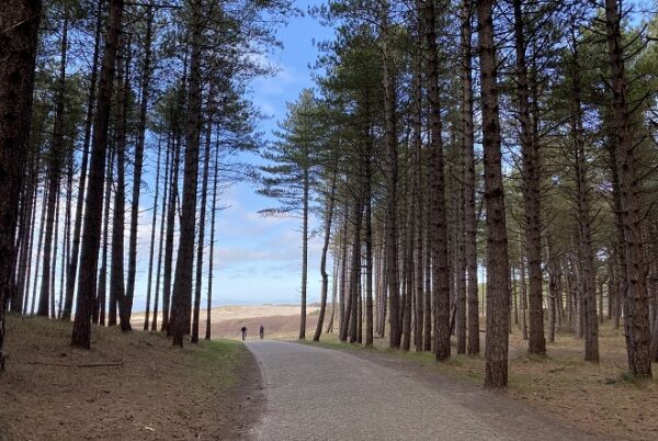 Je loopt alsmaar rechtdoor. Let op hier mogen ook fietsers rijden, dus een beetje aan de kant! Het begin van het pad is verhard en prachtig met die hoge bomen en de duinen op de achtergrond.