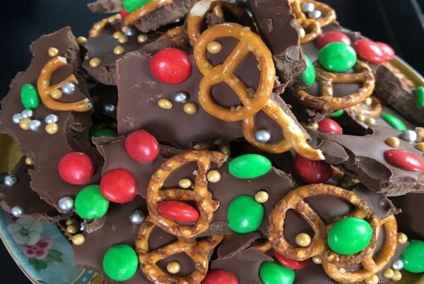 Hmm, deze versierde chocoladestukken zien er verrukkelijk uit! Alle lekkere, zoete ingedriënten rondom kerst zijn samengekomen bij deze verharde chocostukken. Dit kersthapje is heel makkelijk: smelt de chocola, giet het over bakpapier uit en bestrooi het met zoete ingrediënten (zoals spikkels en M&M’s). Tevreden met de creatie? Leg het in de koelkast om goed af te laten koelen, waardoor het één harder geheel wordt. Helemaal afgekoeld? Dan kun je de chocola in stukjes breken en kun je de stukken chocola aan iedereen uitdelen!
