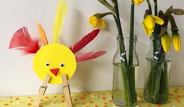 Knutsel eenvoudig een paaskuiken met echte veertjes. Met twee wasknijpers kun je het kuikentje makkelijk laten staan. Gezellig voor op de paastafel tijdens de brunch.