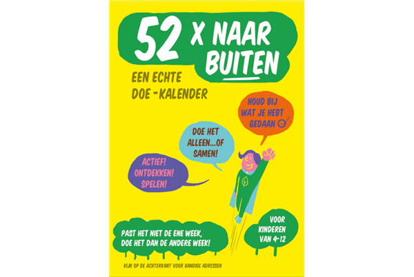 Met de 52x naar buiten-kalender kan je elke week iets nieuws in de natuur bij jou in de buurt doen. Iedere maand zijn er vier dingen die je buiten kunt doen. Past het niet de ene week, dan kan je het natuurlijk ook een week eerder of later doen.