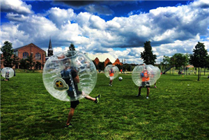 Bij BubbelBal krijg je een grote met lucht gevulde plastic bal om je heen die als stootkussen dient.