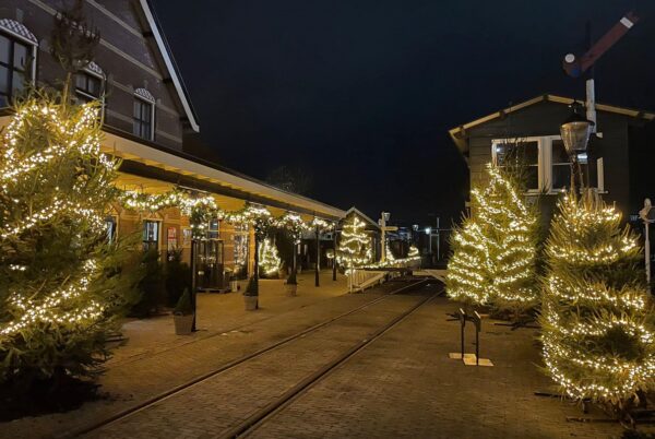 De reis begint op Stoomtramstation Hoorn – het Mooiste Kerststation van Nederland. Je wordt verwelkomd tussen tientallen kerstbomen op het stationsplein, in de wachtkamer en het loket.