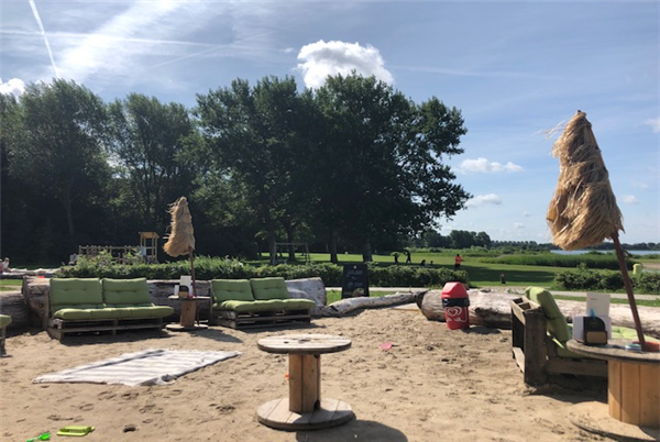 Naast deze strandtent, op steenworp afstand, is een leuke speeltuin op het grasveld van Geestmerambacht en bij lekker weer kunnen ze de kabelbaan gebruiken om over het water te roetsjen!
