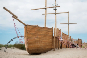 Dit houten Speelschip ‘de Slag bij Camperduin’ ligt bij de lagune op het strand van Camperduin.