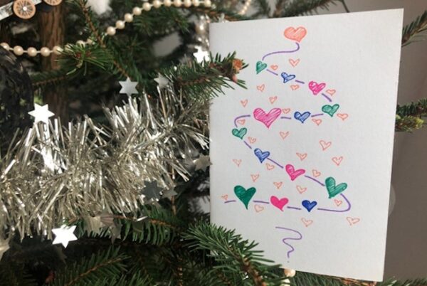 Heb jij alleen papier en stiften tot je beschikking? Geen probleem! Deze kaarten zijn super simpel. Mooie tekst erbij en je bent klaar! Tip: bij de strakke groene kerstboom gebruikte we washitape voor de lijnen die we later wer weg hebben gehaald.