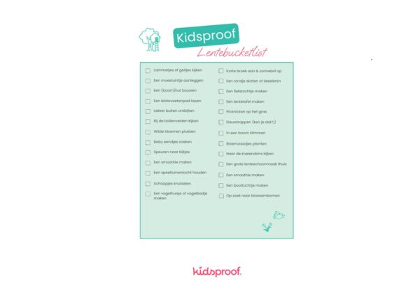 De lente is in volle gang! De zon laat zich weer zien, bloemen bloeien en het is dé tijd om eropuit te trekken. Hebben jullie de Kidsproof Lentebucketlist al gespot? Met 35 vrolijke, frisse activiteiten krijg je zéker het lentegevoel te pakken. Hang ‘m op de koelkast, trek je sneakers aan en vink samen met je kids alle leuke dingen af. Hoeveel kunnen jullie er nog doen voordat de zomer begint?