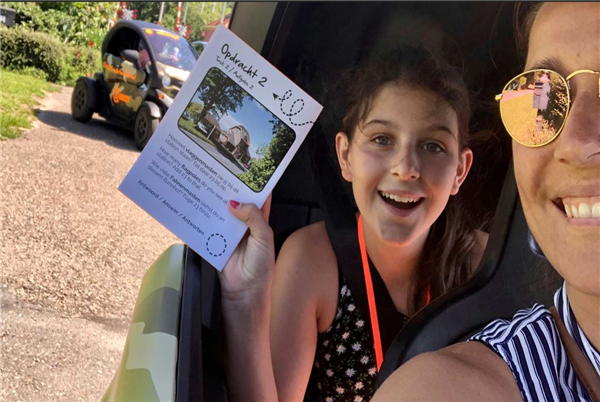 De kinderen krijgen walkie talkies mee, zodat ze vanuit de autootjes met elkaar kunenn communiceren en de puzzeltocht helpen oplossen!