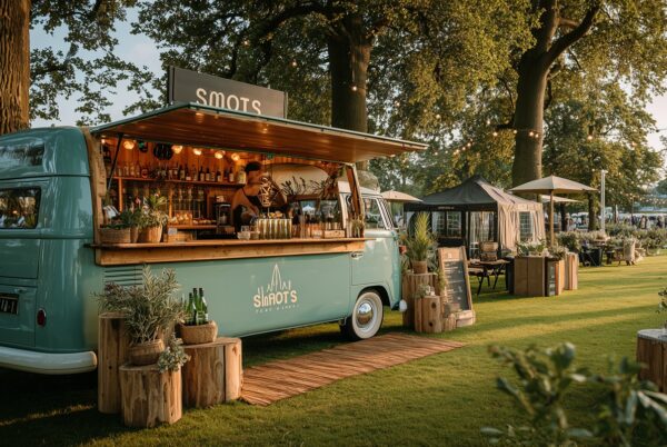 - Lange tafels onder de bomen, versierd met bloemen en linten