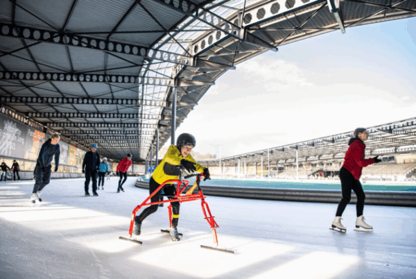 Ook dit seizoen kunnen kinderen met een handicap deelnemen aan de schaatspret. Dat is mogelijk dankzij het schaatsframe. Hiermee kunnen kinderen die door een fysieke beperking niet zelfstandig kunnen staan of bewegen, toch glijden over het ijs.