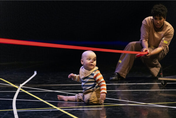 Je hoort de klanken van een cello. Een rol toneeltape rolt voorbij over het toneel. Waar komt die vandaan? Iemand maakt met tape een strakke lijn op de vloer en rolt later op een karretje voorbij.