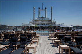 Werelds genieten met uitzicht op de magische skyline van Rotterdam op een voormalig cruiseschip.