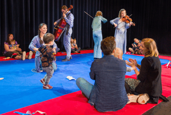 Je dreumes is welkom op het grote kleed. Vlakbij de drie muzikanten die mooie kerstmuziek spelen. Jouw kleintje mag meedoen: dansen, spelen met het muzikale speelgoed en aan het eind een échte viool vasthouden.