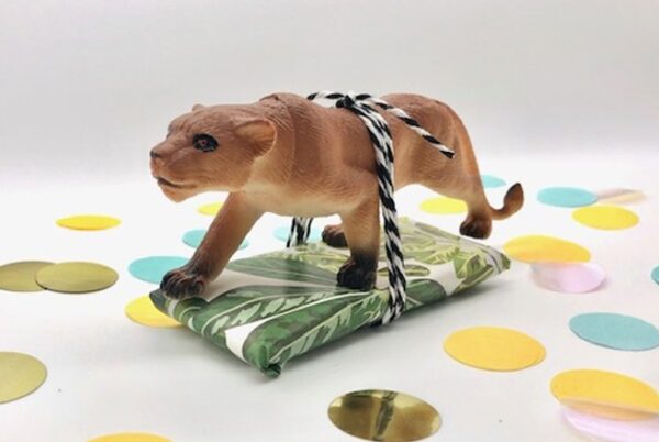 Voor stoere kids pak je een voorverpakte reep ontbijtkoek in met zwart pakpapier. Teken er vervolgens een stippellijn op met een witte krijtstift en plak er een klein autootje op. Of maak een grappig monstertje van een drinkpakje, gekleurd papier, stickers, veertjes, stiften en wiebelogen. Ook leuk: pak een (muesli)reepje of doosje rozijnen in met een vrolijk papiertje. Met slagerstouw bind je daar een dier op vast en klaar is jouw jungle traktatie!