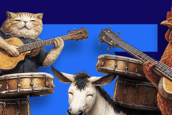 Op een piepklein, omheind veldje zit een drukke, speelse hond (saxofoon) die continu regels moet opvolgen van zijn baasje. Als de hond niet luistert krijgt hij straf. De ezel overtuigt hem dat een vrij leven als straatmuzikant veel leuker is. Ze gaan samen verder. Onderweg ontmoeten ze een haan (viool) die weigert te kukelen en liever danst op zijn eigen ritme. De ezel en hond nemen de haan mee onder hun vleugels. En wanneer ze ook nog een poes met een oorlogstrauma tegenkomen, is het kwartet compleet.