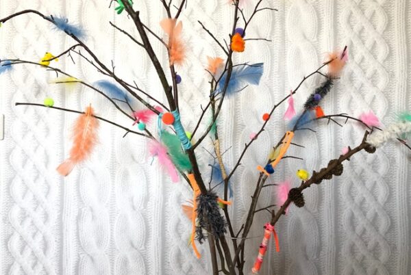 Deze paastak is lekker vrolijk en bont. Verzamel allerlei knutselmaterialen zoals losse takjes, bolletjes wol, veertjes en figuurtjes en lijmen maar. Het touw wikkel je om de tak en zet je vast met een knoopje. Ziet er direct heel anders uit! Laat ieder kind een paar takjes versieren en wat versiering erop plakken. Nu alleen nog een mooie vaas zoeken!