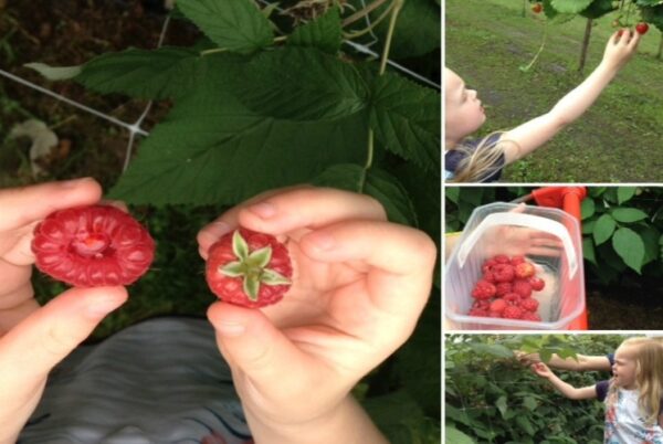 Frambozen plukken was best een uitdaging, veel was al geplukt en veel moest nog een kleurtje krijgen in de zon. Papa was toch fanatieker dan gedacht en had zelfs een tactiek bedacht. Ga op peuterhoogte door de paden en kijk dan de struik in. En ja hoor, kassa! Een hele bak vol. Vergis je niet, dit zijn niet de kleine bakjes die je afrekent in de supermarkt. Nee, dit bakje had hetzelfde formaat als het aardbeienbakje. Voor plusminus 800 gram frambozen betaal je € 7,-. Je hebt lol, je hebt ze zelf uitgekozen en laten we eerlijk zijn die smaken het lekkerst.