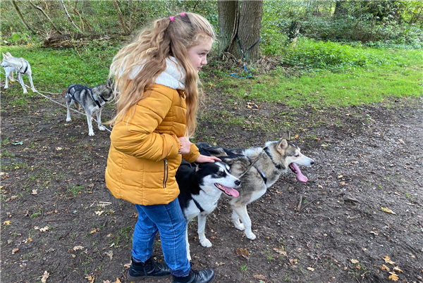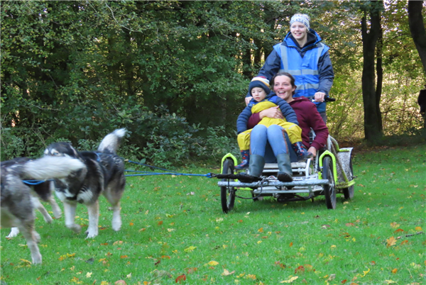 Tijdens deze ronde krijg je een heupgordel. Hieraan wordt met een lijn 1 husky vast gemaakt. Zo wordt je dus echt vooruit getrokken door ‘jouw’ hond en hoef je alleen maar je benen op te tillen om vooruit te komen (en een beetje tegen te hangen zodat je niet voorover klapt…..) Deze activiteit is te boeken voor grote groepen (tot max. 15 deelnemers). Kinderen tot 8 jaar kunnen mee, maar krijgen geen eigen hond. Als alternatief neemt de gids 2 honden mee om af en toe te delen. Er kan ook worden afgewisseld met 1 van de ouders/verzorgers.