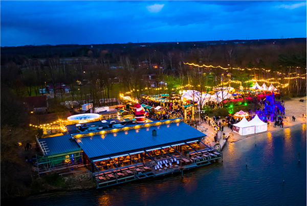 Glinsterende lichtjes versieren de kraampjes vol met delicatessen en bijzondere kado's op deze kerstmarkt