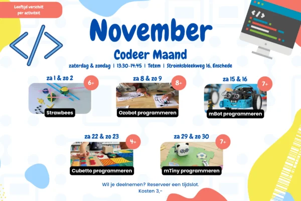 November is codeer maand bij Tetem. Door verschillende instapworkshops leer je meer over creatief coderen en robotica.