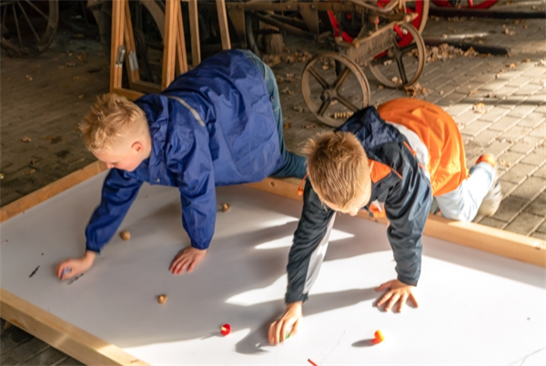 Sjoelen, tollen, blikgooien, bloemen knutselen, klosslingeren, doolhof en gatenkaas?