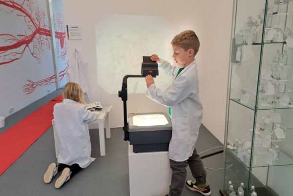 In de volgende ruimte vinden we een to-do die we uiteindelijk één van de leukste vinden. Bij van mond tot kont trek je eerst als een echte arts een witte jas aan. Daarna teken je op een sheet de binnenkant van je lichaam waarbij je de reis van mond tot kont weergeeft. Met behulp van de overhead projector projecteer je de binnenkant op je eigen lijf. Dat is echt tof!