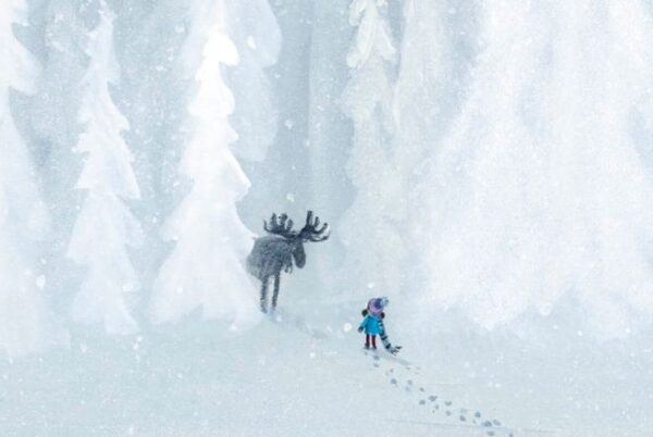 Als Sofie door de stad dwaalt, steekt er een sneeuwstorm op. En midden in die witte wereld doemt opeens een gedaante op: een eland, die Sofie meeneemt naar het winterbos. Daar staat, tussen alle grote bomen, een kleine dennenboom, als een kerstboom zonder versiering.