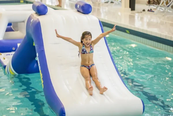 Met hoge snelheid van de 50 meter lange glijbaan, even ontspannen in het bubbelbad, terwijl de kleintjes zich vermaken in het peuterbad: in het overdekte zwembad kan het!