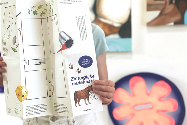 Hoe beleef jij kunst? Met de zintuiglijke routekaart kunnen kinderen de tentoonstelling op hun eigen, speelse manier beleven. Ze worden gestimuleerd om met hun zintuigen hun eigen route door de tentoonstelling te maken. Je gebruikt niet alleen je ogen om kunst te bekijken, want je kunt zien, horen, ruiken, proeven en voelen. Op de kaart staan vragen die ze helpen op hun ontdekkingstocht, en het mooie is: die werkt bij elke tentoonstelling.