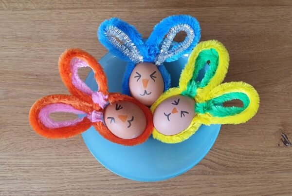 Heb je nog chenilledraad in de knutsella liggen? Maak dan deze blije paashaaseitjes. Vouw het draad in de vorm van paashaasoren om de eieren heen en teken er een konijnengezicht bij!