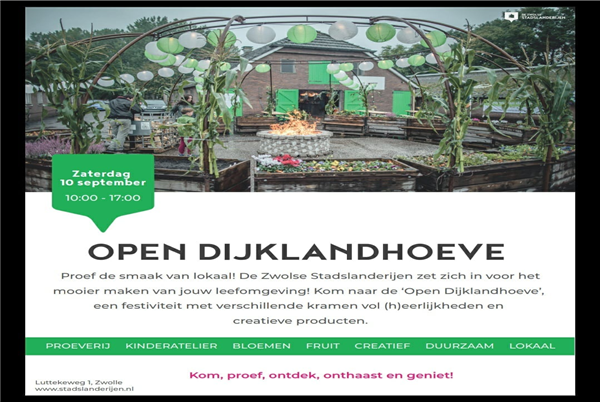 Ze maken weer een gezellig event. Vol met proeverijen, creatieve, duurzame en of biologische ondernemers uit Zwolle en directe omgeving op het erf van de Dijklandhoeve. Kom, proef, pluk en ontdek.