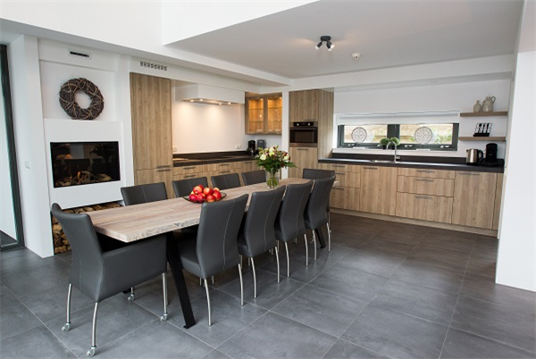 Rondom het vakantiehuis ligt een onder architectuur aangelegde tuin met een ruim zonneterras direct aangrenzend aan de woonkeuken en middels een schuifpui drempelloos bereikbaar. Aan de achterzijde van het huis is een overdekt terras gerealiseerd met 10 zitplaatsen, houtkachel en bergingsruimte. Dit terras kijkt uit over de tuin, speelveldje en trampoline met schommelbank.